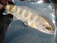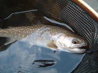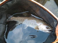 魚がようやく走らなくなったので、リリースネットでランディングした。頭が大きく、鼻が曲がりかけた、立派なオスのイワナだった。ネットの内径に5mmほど足りなかったので、26cmといったところだ。日影ができた大淵に、陸生昆虫がポトリと落ちたところを捕食していたのだろう。水面に張り出した木の枝の下に定位していたんだな。お食事中に悪いことをしてしまったようだ。