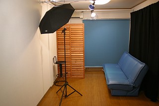 室内撮影は、私の住んでいるアパートに、仮設のスタジオを組んで行っています。 10畳程の大きさのリビングで、背景紙・ソファー・カーテン等を背景としての撮影が出来ます。 照明は、1200Wのストロボ2灯がメインで、500Wのレフランプ数灯を補助で使用します。
